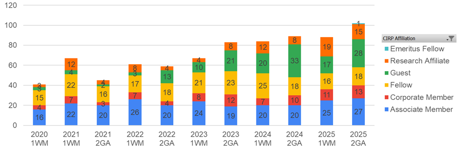 We are happy to report that this action has been fruitful. Figure 1 shows the number of attendees of STC E meetings from 2020 to 2025. We see stable attendance from our Members and Fellows accompanied by an increasing number of guests, indicated in green, from 2022.